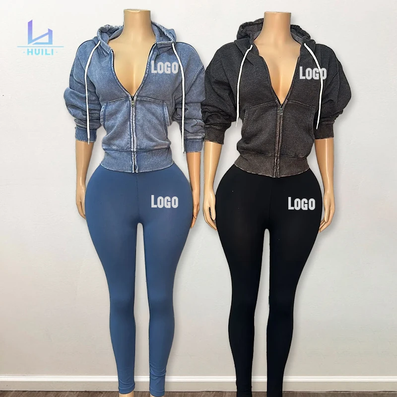 Huili 2025 New Trending Vintage Washed Two Piece Matching Set Zip up Hooded Jacket & Activewear Leggings Custom Hoodie Set Women